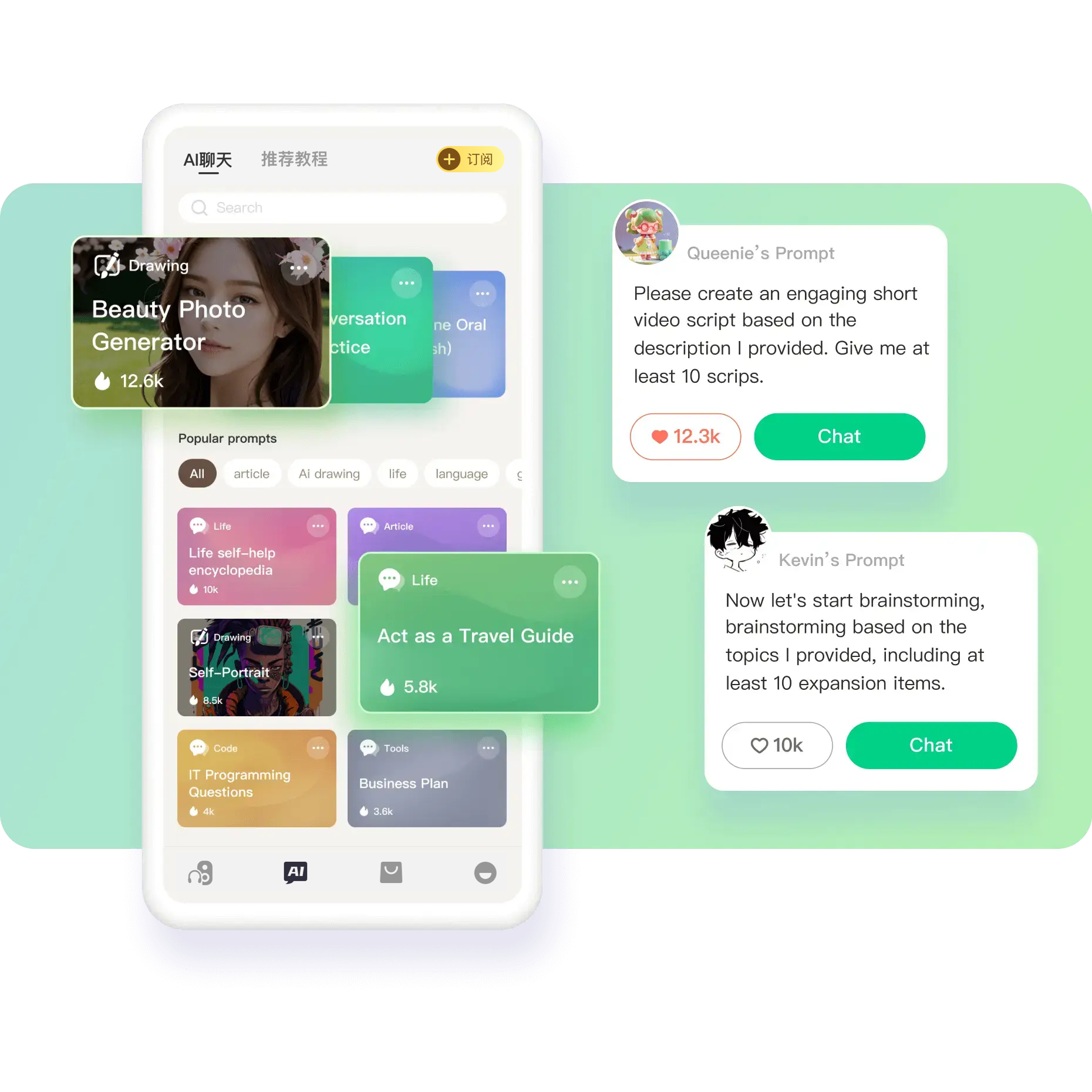 会话发起时,AI语言模型上千的聊天提示词开始随时待命,探索中辅助释放你的想象空间,提高效率节省时间。